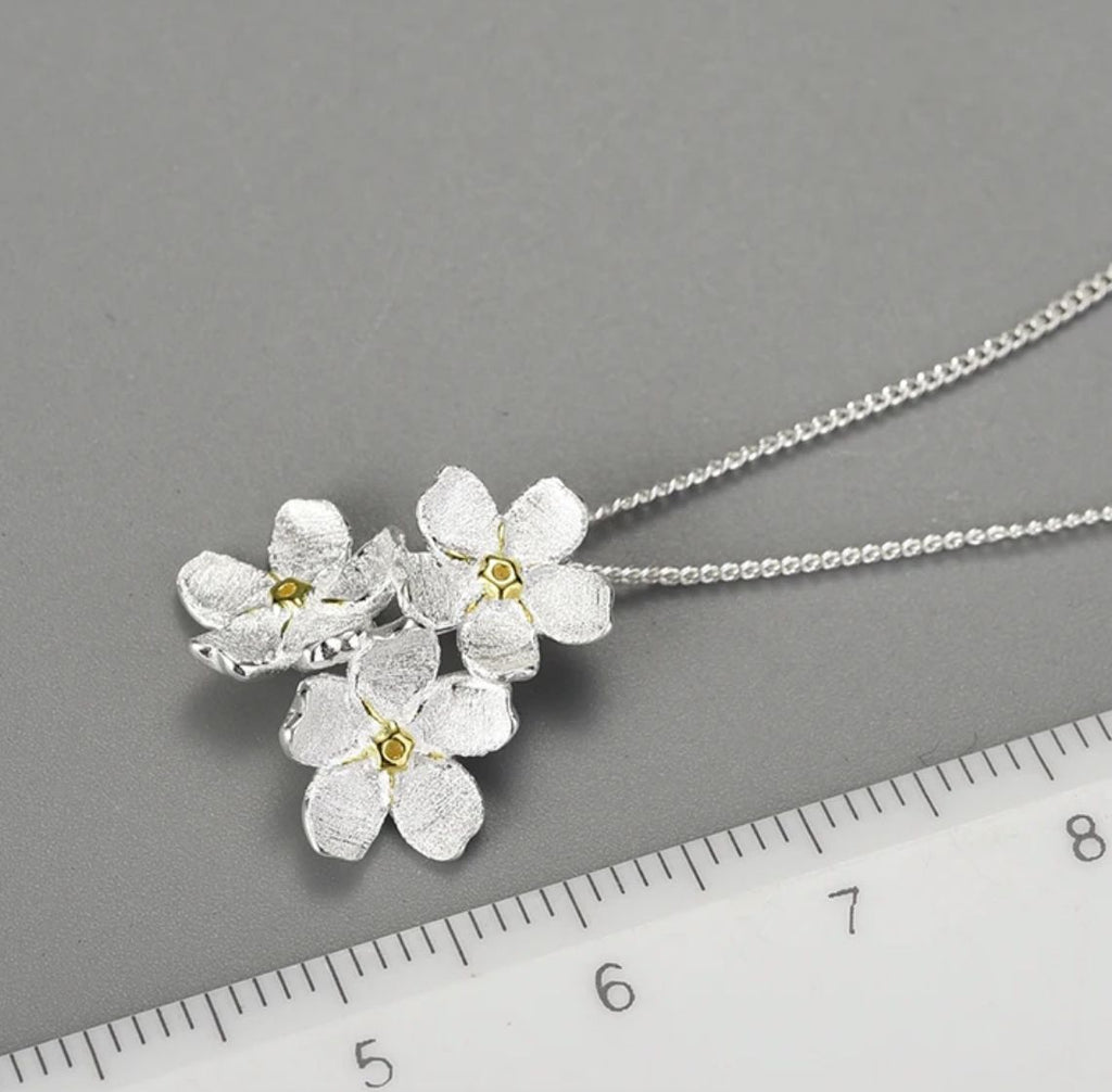 The Forget Me Not Necklace is a delicate and enchanting piece, crafted from high-quality 925 sterling silver / gold-plated. This necklace features three small, intricately detailed flowers, each representing the timeless beauty and sentimental charm of the forget-me-not bloom.