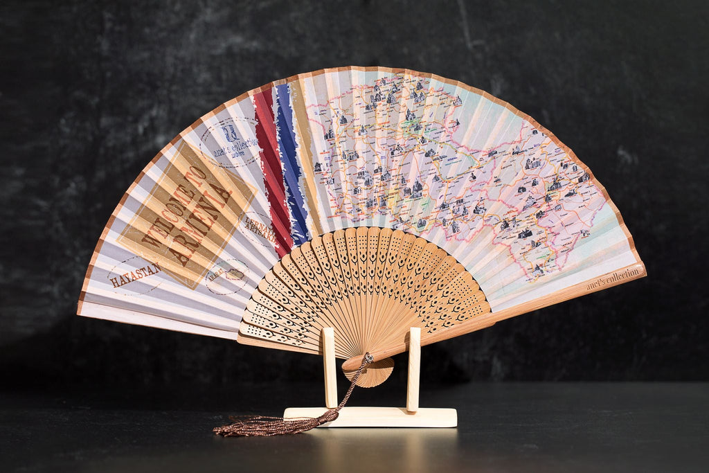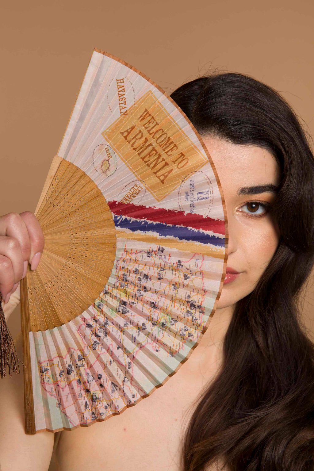 Featuring bamboo ribs in a natural warm hue, the fan's base serves as a canvas for a captivating printed fabric that tells the story of Armenia's legacy. Adorned with a shimmery brown tassel, it exudes a touch of opulence, adding a dash of glamour to your ensemble.