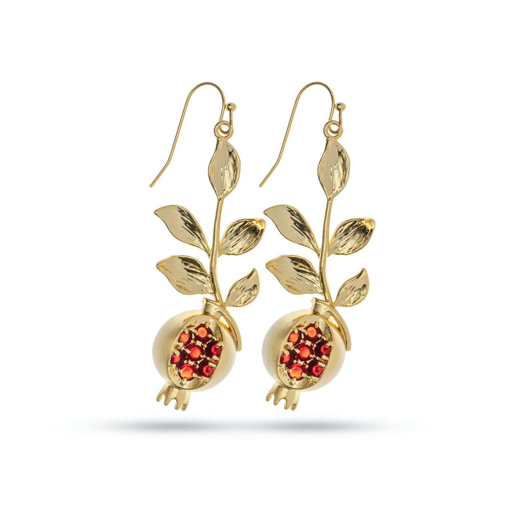 Introducing Pamela Twig's Pomegranate collection earrings, featuring a half open pomegranate design with intricate details of seeds and leaves. Crafted in gold-plated metal and adorned with sparkling zircon gemstones, these 2" earrings are a stunning addition to any jewelry collection.