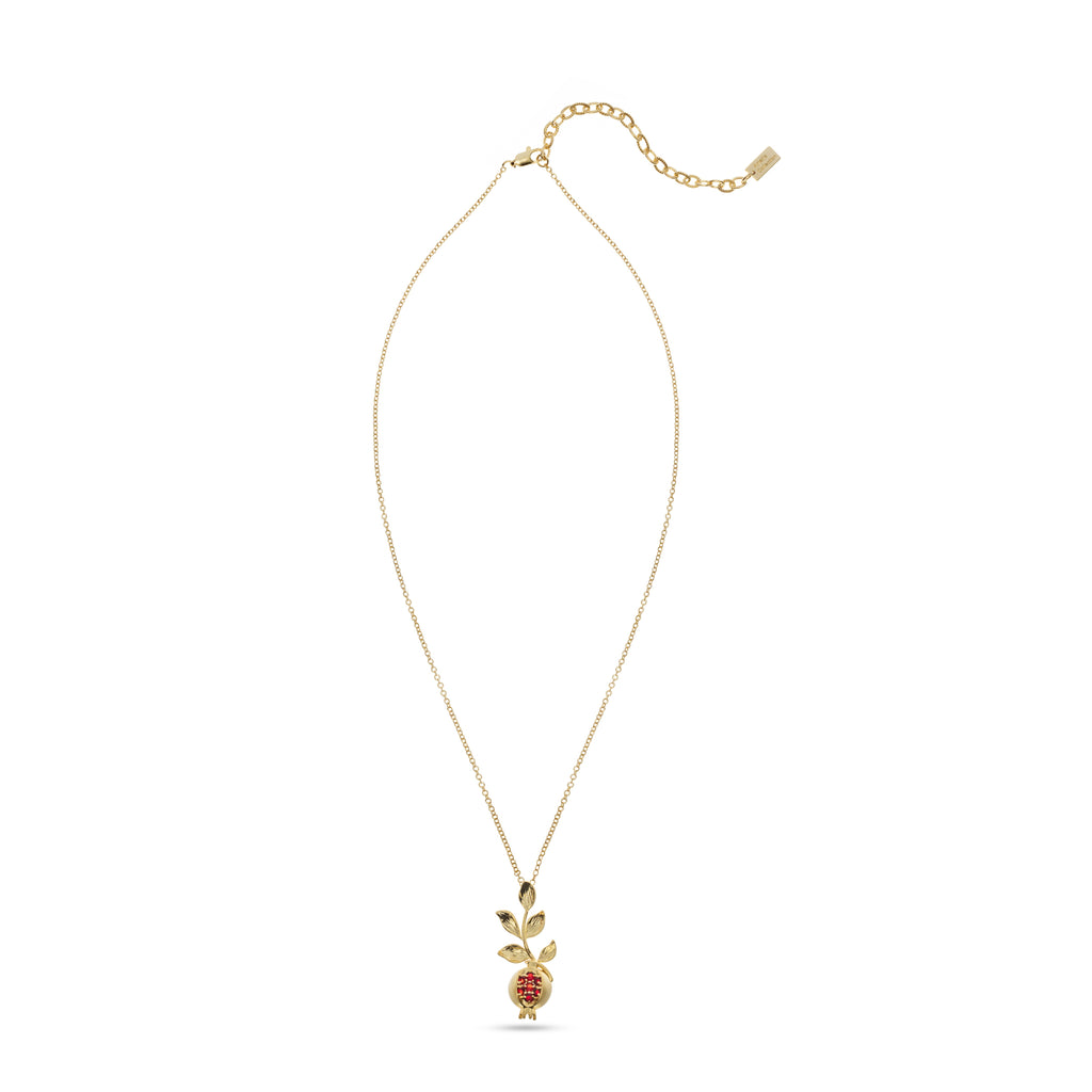 Introducing the Pamela Twig Necklace: a fresh addition to any jewelry collection. This unique necklace features a half-open pomegranate fruit with zircon gemstone seeds and a golden leaf, symbolizing the essence of life. With an adjustable 16"-18" chain and 18K gold plating, this necklace adds a touch of elegance to any outfit.