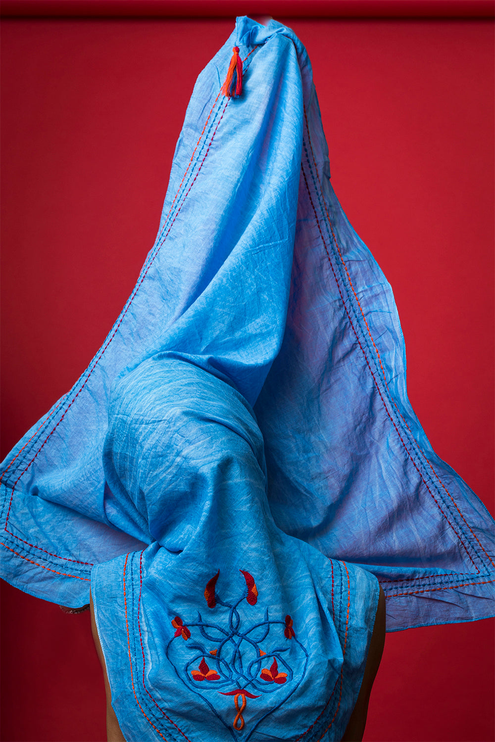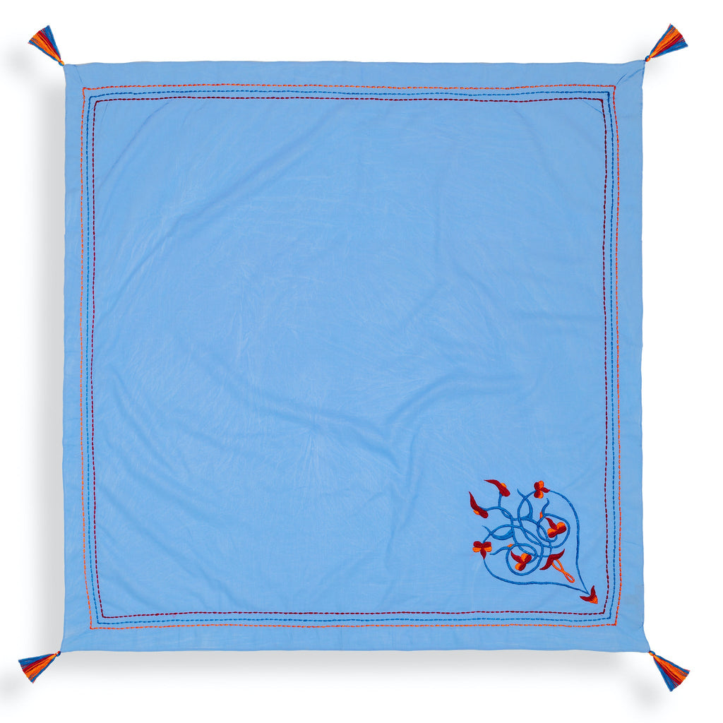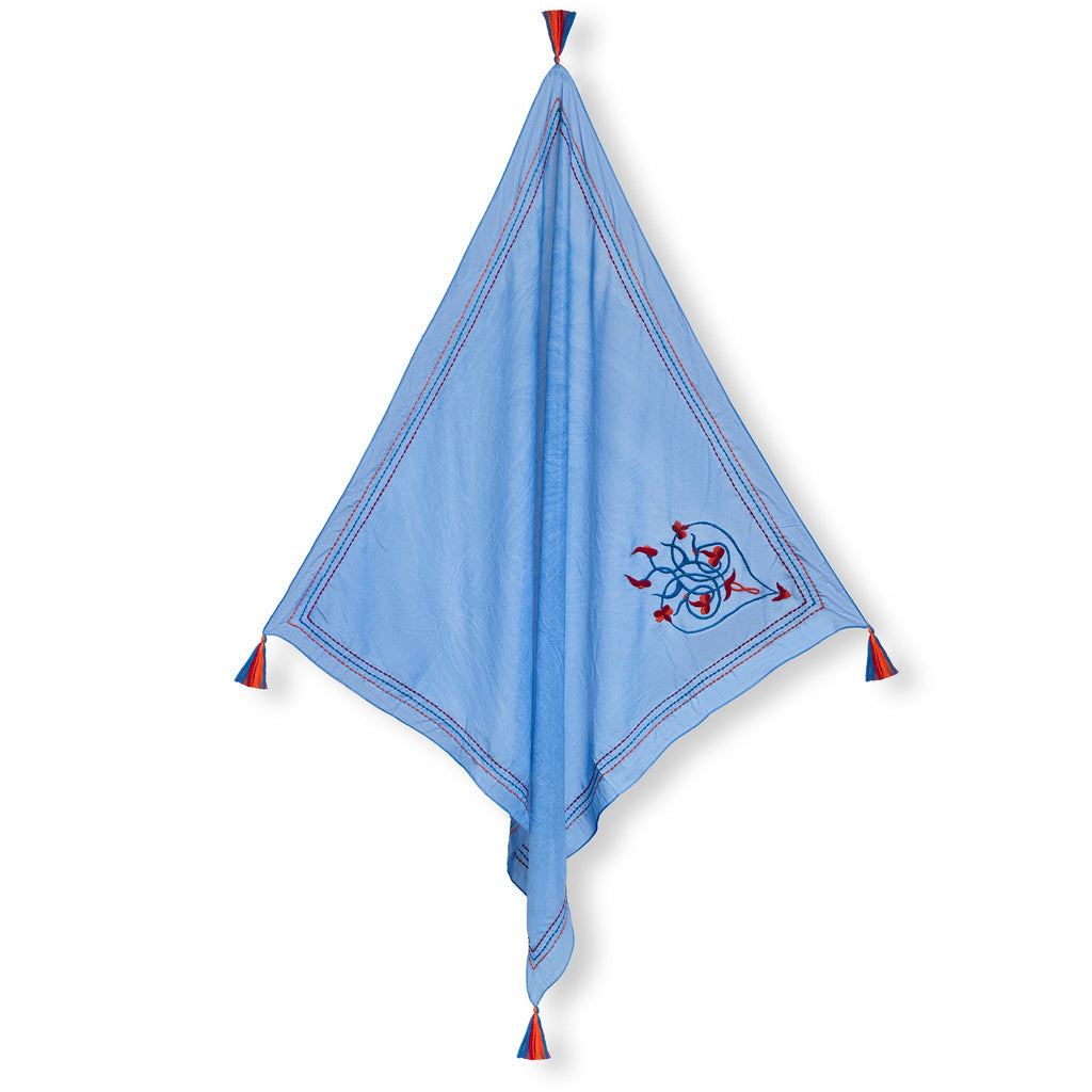 At the heart of this square scarf lies a delicate, ornamental embroidery—featuring a heart entwined with blooming florals—rendered in a harmonious trio of Red, Blue, and Orange threads. Each color symbolizes an element of love: passion, loyalty, and warmth. The intricate design resembles a knot—beautifully tied, impossible to break—symbolizing the strength and unity of true connection.