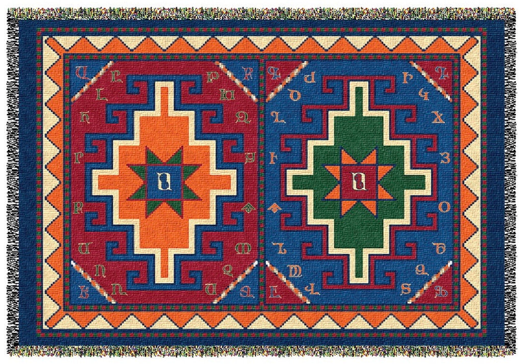 A ballad of the Armenian Alphabet laid over a traditional Armenian carpet. The Red, Blue and Orange colors of the Flag and motif's give clues to the purpose of the cultural identity.