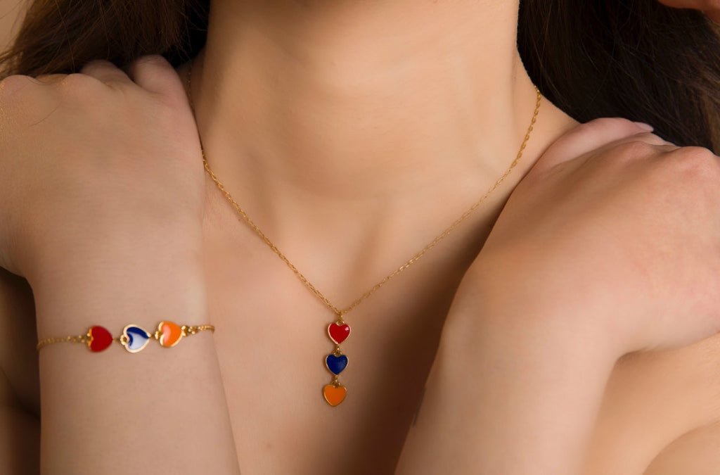 Celebrate heritage and identity with the Hearts of Armenia Bracelet, a meaningful and elegant piece from Anet’s Collection. Thoughtfully designed by Anet Abnous, this bracelet features a delicate adjustable gold-plated brass chain, adorned with three vibrant enamel hearts in red, blue, and orange – the symbolic colors of the Armenian national flag.