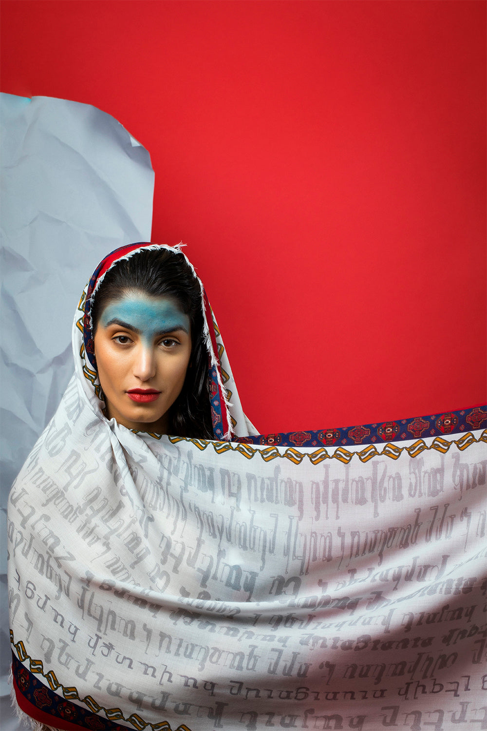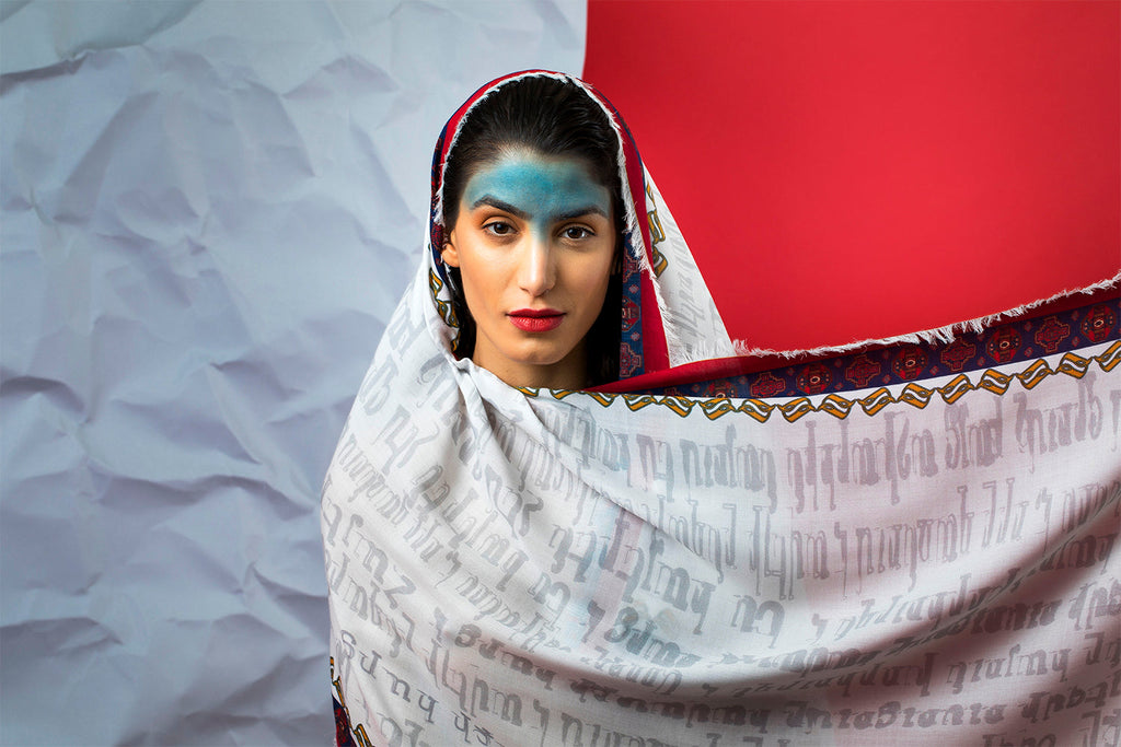 Inspired by the traditional Armenian Rug with colors of red and deep blue. Anet's reminiscence of the Armenian heritage. The border of the scarf has weaving designs of Armenian carpet design while in the body she has chosen a woodcut block printing of famous William Saroyan words. Anet has named the scarf design after her Grandmother "Hyeganoosh".