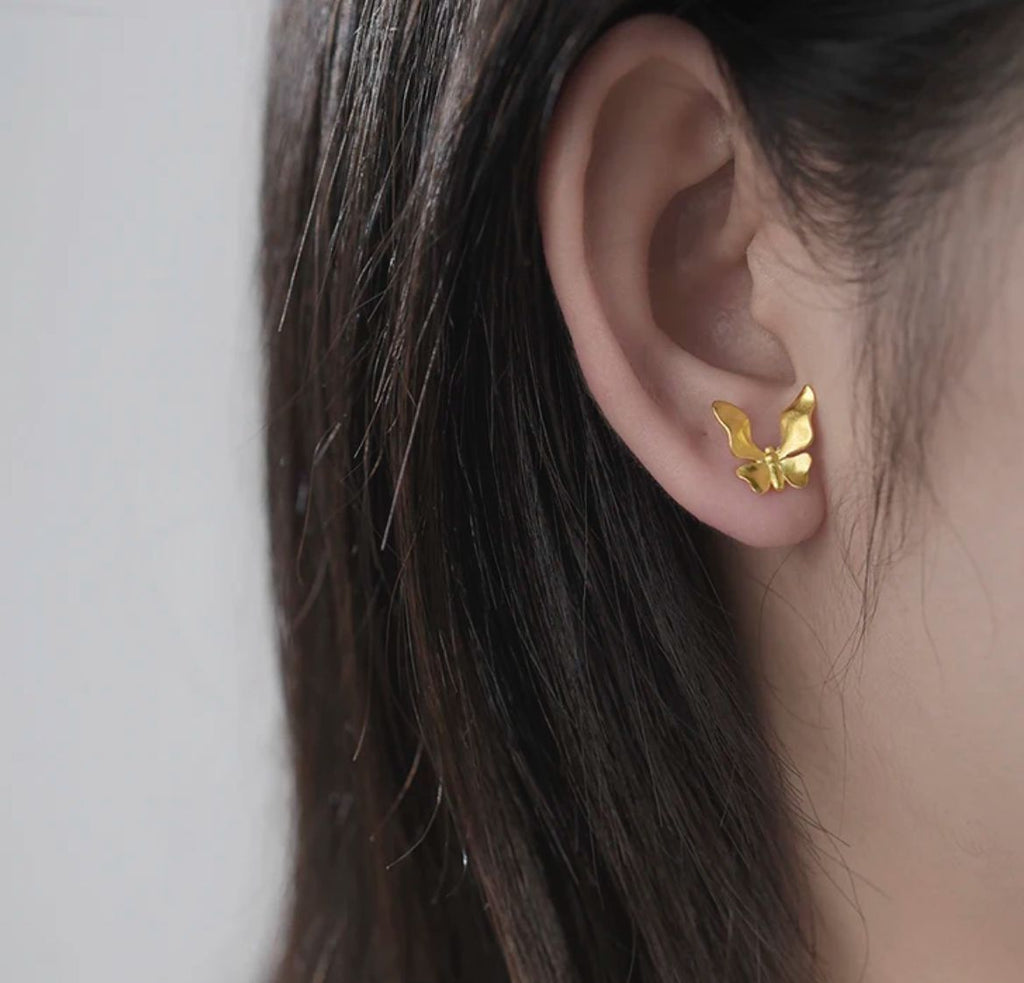 Add a touch of whimsy to your outfit with these eye-catching 925 silver / 18K gold-plated Petite Butterfly Stud Earrings.
