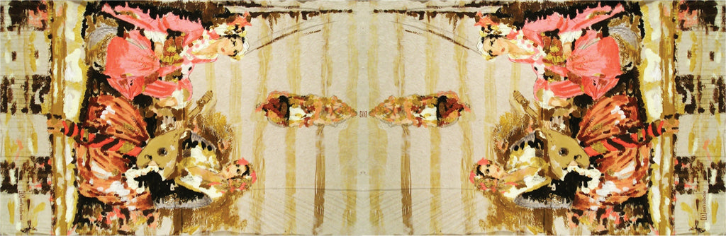 Expertly printed in mirrored pairs, the artwork runs across the length of the scarf, creating a beautifully balanced design. The soft, lightweight blend of 70% cotton and 30% silk offers a gentle drape and a luxurious feel against the skin, making it a versatile accessory for any season.