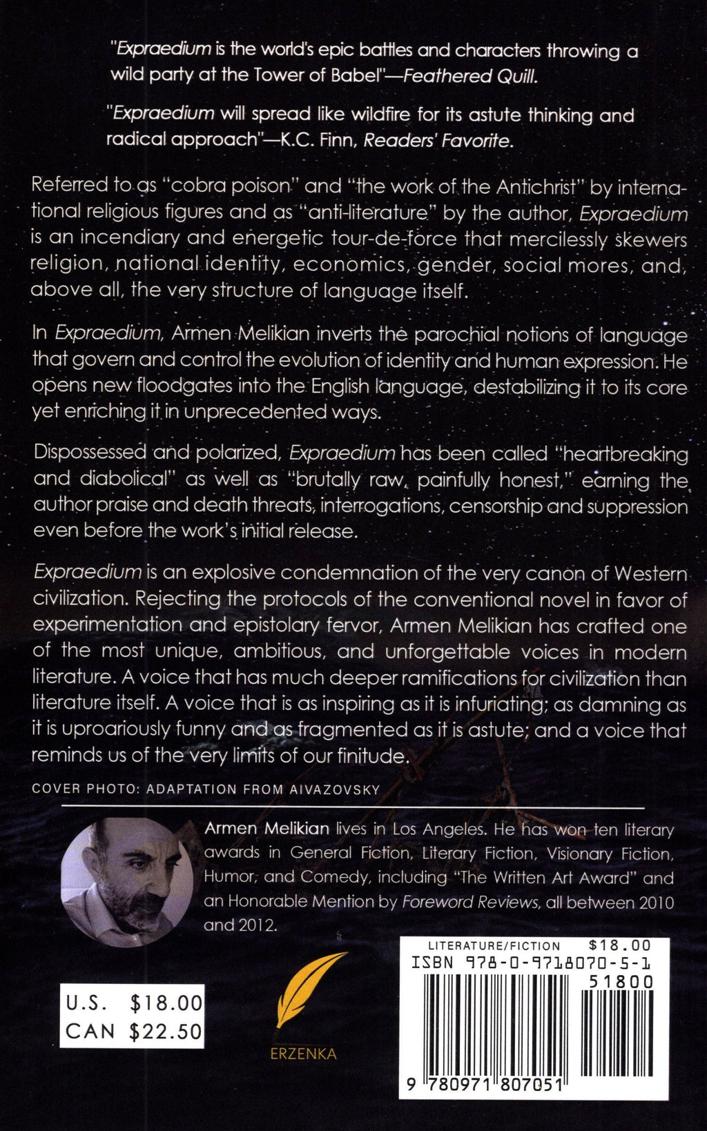 Referred to as "cobra poison" and "the work of the Antichrist" by international religious figures, as "anti-literature" by the author, Expraedium is an incendiary and energetic tour-de-force that mercilessly skewers religion, national identity, economics, gender, social mores, and the very structure of language itself. Expraedium inverts the parochial notions of language that control the evolution of identity and human expression. It opens floodgates into the English language, destabilizing it to its core yet enriching it in unprecedented ways. Equal parts satire and philosophy, polemic and prophecy, Expraedium explores Brathki's journeys via dysfunctional social and cultural strata in his epic search for the land of Urmashu, igniting the protagonist's inimitable voice--a voice at once acerbic, oracular, and obscure.Expraedium has been called "heartbreaking and diabolical" as well as "brutally raw, painfully honest," earning the author praise and death threats, interrogations, censorship and suppression even before the work's initial release.Expraedium is an explosive condemnation of the very canon of Western civilization. Rejecting the protocols of the conventional novel, Melikian has crafted one of the most unique, ambitious, and unforgettable voices in modern literature. A voice that has much deeper ramifications for civilization than literature itself. A voice that is as inspiring as it is infuriating, as damning as it is uproariously funny, and as fragmented as it is astute; a voice that reminds us of the very limits of our finitude and our unquenchable thirst to overcome it.