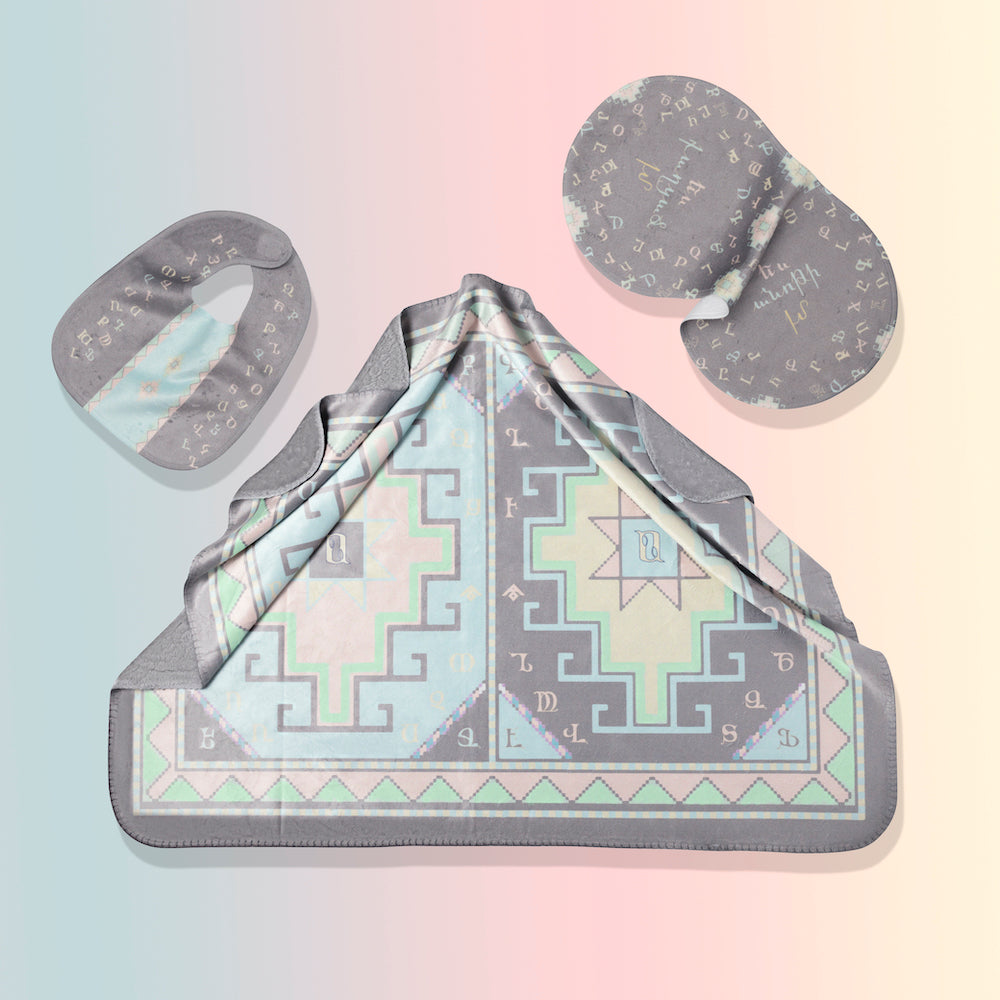 Armenian Alphabet Unisex baby blanket, Bib and Burp cloth set with a ballad of the Armenian Alphabet laid over a traditional Armenian carpet in pastel colors of pink, purple, blue and green on a grey base. It is ready for gifting in a clear box with gift wrapping.