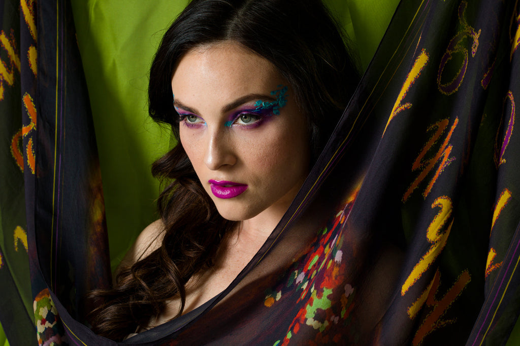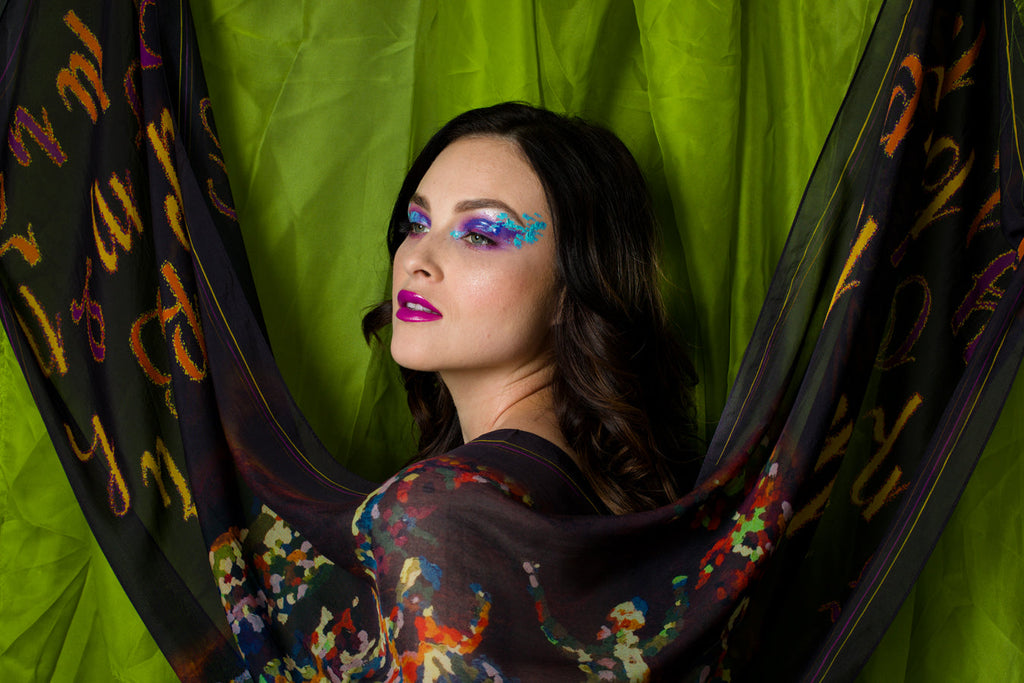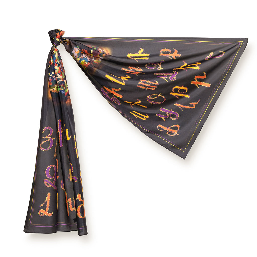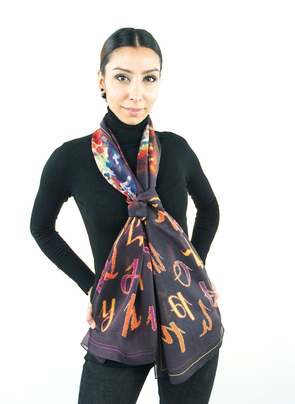 The center print, created by Anet Abnous, adds a personal, artistic touch to the piece. Anet Abnous's original work serves as the focal point of the scarf, which ties together the cultural elements of language and dance into a visually stunning composition.