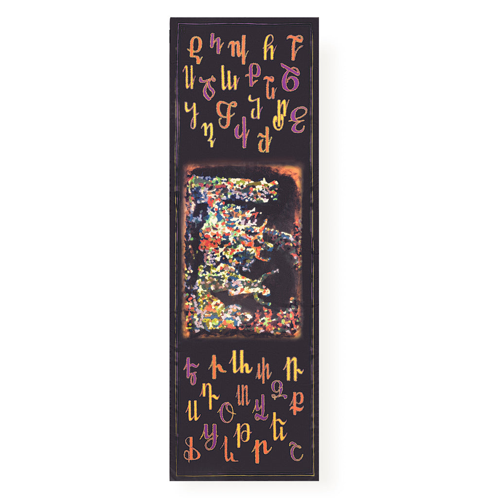 The Armenian Alphabet, which is featured along the two sides of the painting, likely represents the deep cultural heritage of Armenia. The Armenian language, with its unique and ancient script, holds great significance in preserving the identity and history of the Armenian people. The script on the scarf may not only serve as an artistic detail but also as a tribute to the importance of written language in preserving and passing down culture.