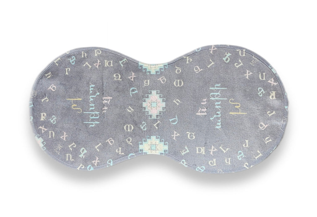 Armenian Alphabet unisex Peanut shape baby burp cloth with a ballad of the Armenian Alphabet laid over a traditional Armenian carpet design in pastel colors of pink, purple, blue and green on a grey base.