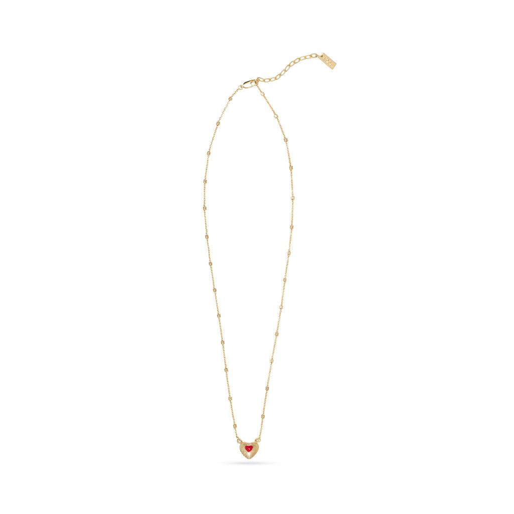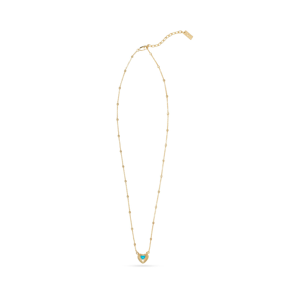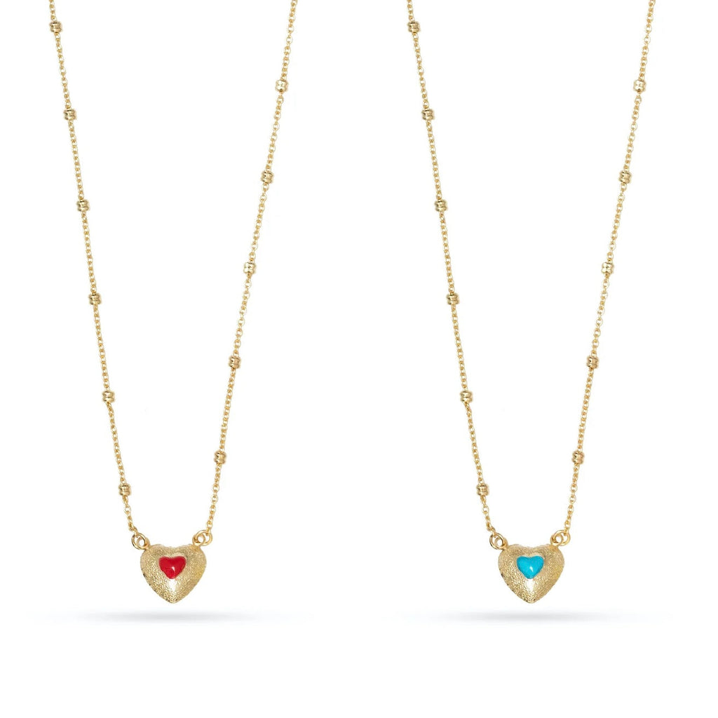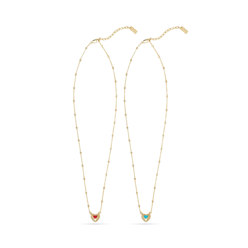 Introducing our stunning Double Heart Gold Plated Necklace with Enamel in two vibrant colors of turquoise and red, featuring a dainty chain with small dots that can be adjusted from 16" to 18" to fit any neckline perfectly.