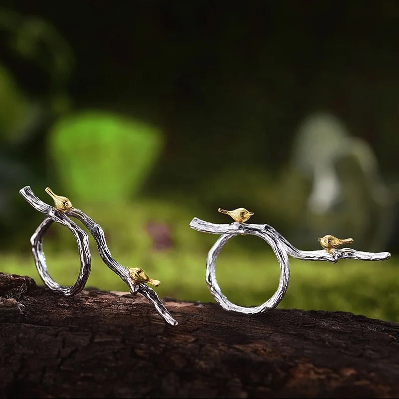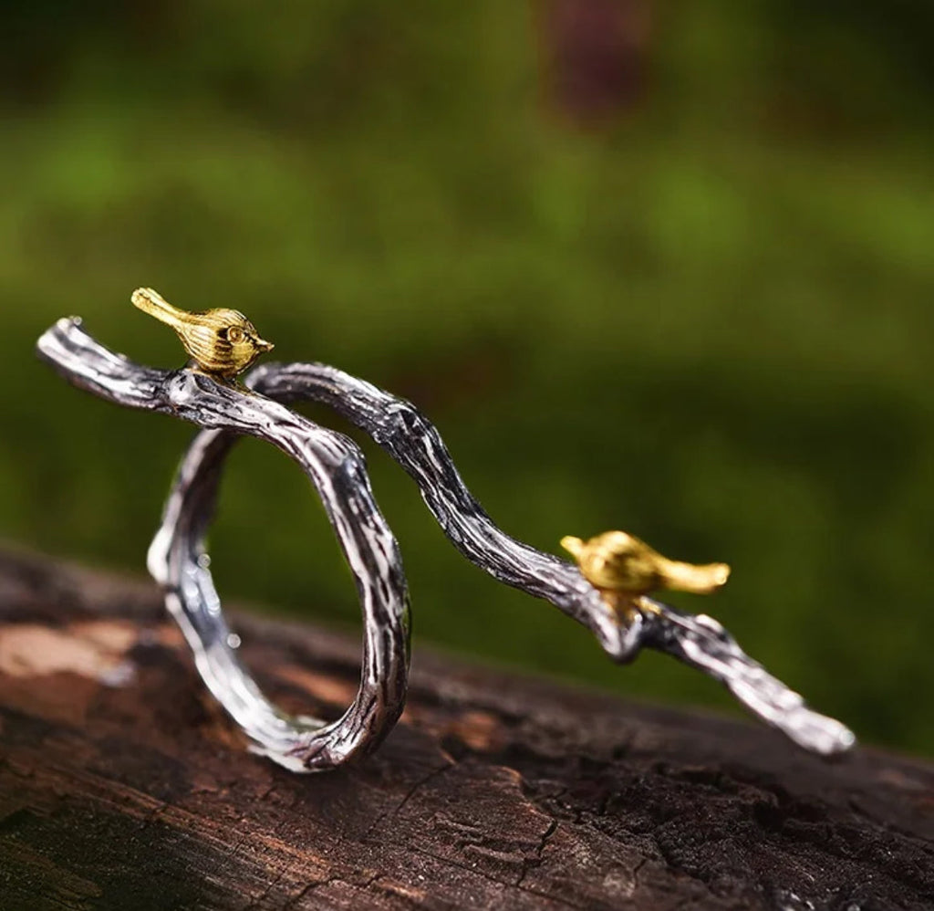 Expertly crafted in 925 silver, this artistic Nightingales on Branch ring features two delicate golden birds perched on its intricate design. Perfect for nature lovers, this unique piece adds a touch of whimsy to any ensemble. Show off your love for the outdoors with this stunning and timeless ring.