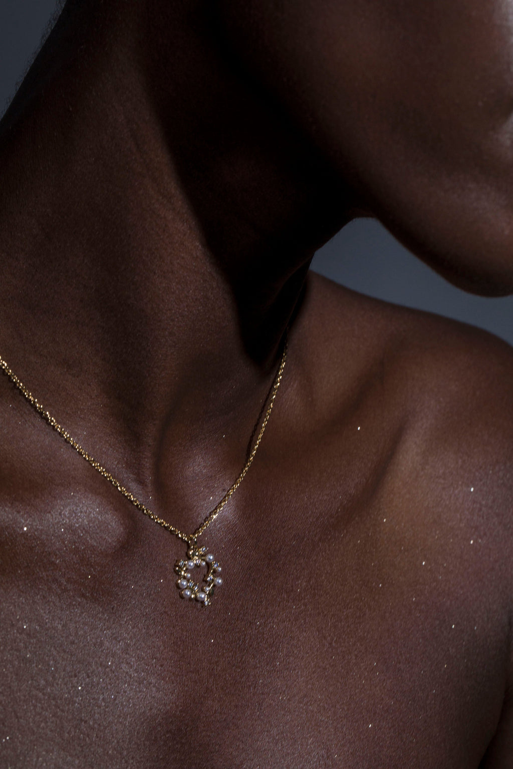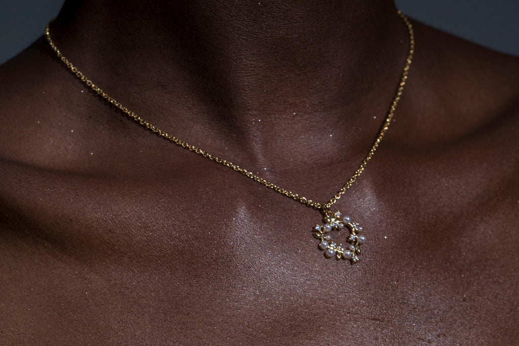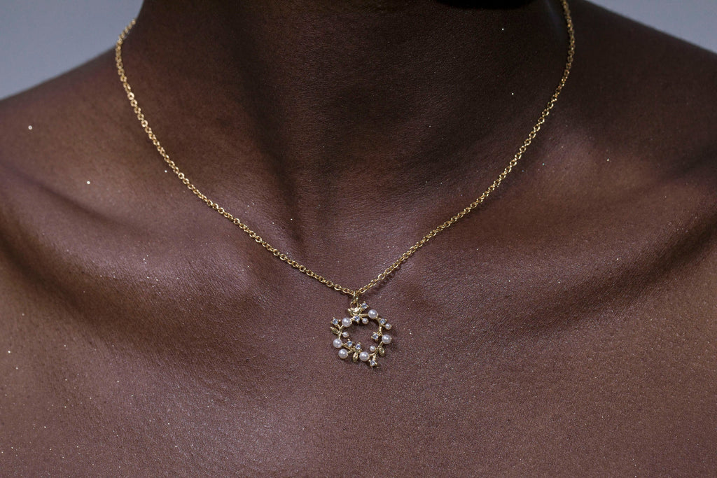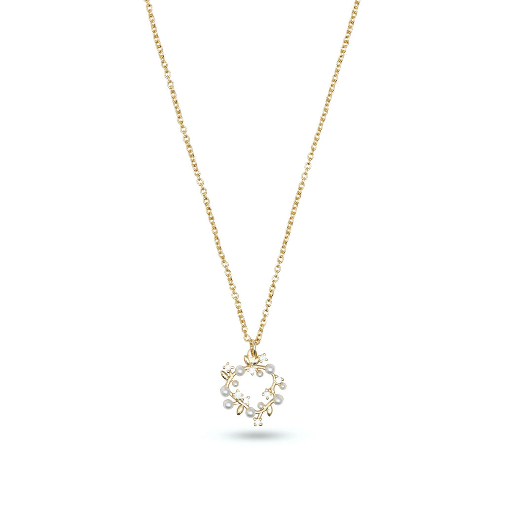 Introducing our breathtaking Gold-Plated Pearl and Small Diamond Wreath Necklace – a true symbol of opulence and refinement. Embrace the beauty of nature with this intricately designed wreath-shaped pendant, adorned with lustrous pearls and glistening small diamonds.